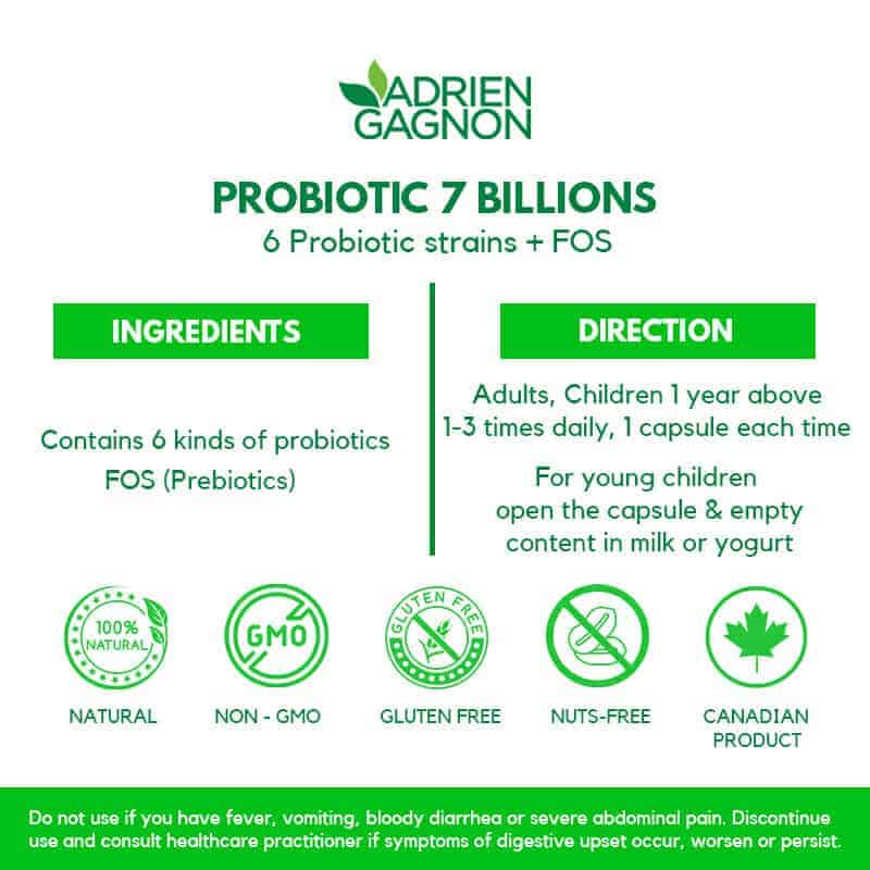 Adrien Gagnon Probiotic 7 billion’s formula comprises six different strains of probiotics and is more effective than a single strain of probiotics. It helps to:
