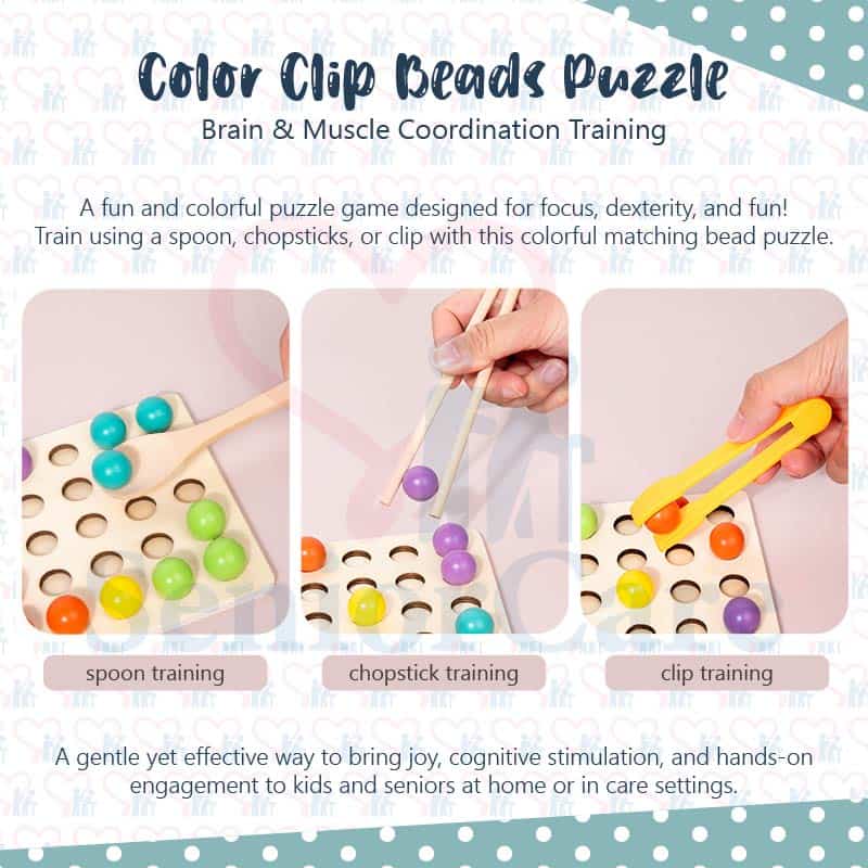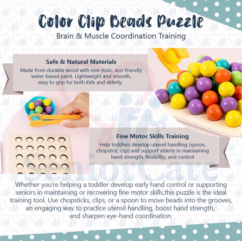 The Colour Clip Beads Puzzle Board Game is more than just a colorful activity, Whether you’re helping a toddler develop early hand control or supporting seniors in maintaining or recovering fine motor skills, this puzzle is the ideal training tool. Use chopsticks, clips, or a spoon to move beads into the grooves—an engaging way to practice utensil handling, boost hand strength, and sharpen eye-hand coordination.