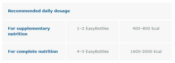 To be determined by a health care professional according to patient’s needs. Recommendation for supplementary nutrition 1-2 bottles (400-800 kcal)/day or complete nutrition 4-5 bottles (1600-2000 kcal) /day.