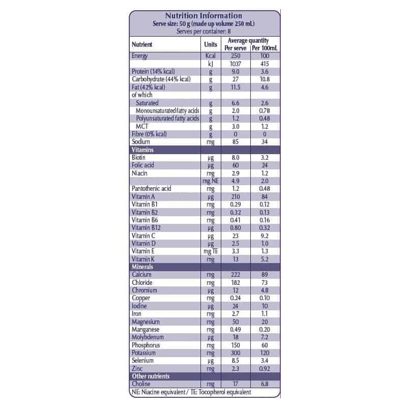 Glucose syrup, casein* (milk), sucrose, milk fat, medium chain triglycerides, minerals (potassium citrate, calcium phosphate, sodium citrate, calcium carbonate, magnesium chloride, potassium hydroxide, potassium chloride, ferrous sulphate, zinc sulphate, magnesium oxide, manganese sulphate, copper sulphate, sodium molybdate, potassium iodide, chromium chloride and sodium selenate), vegetable oil (corn kernel), emulsifier (soy lecithin), vitamins (C, E, niacin, calcium pantothenate, B6, B1, A, B2, folic acid, K, biotin, D, B12) and choline bitartrate.