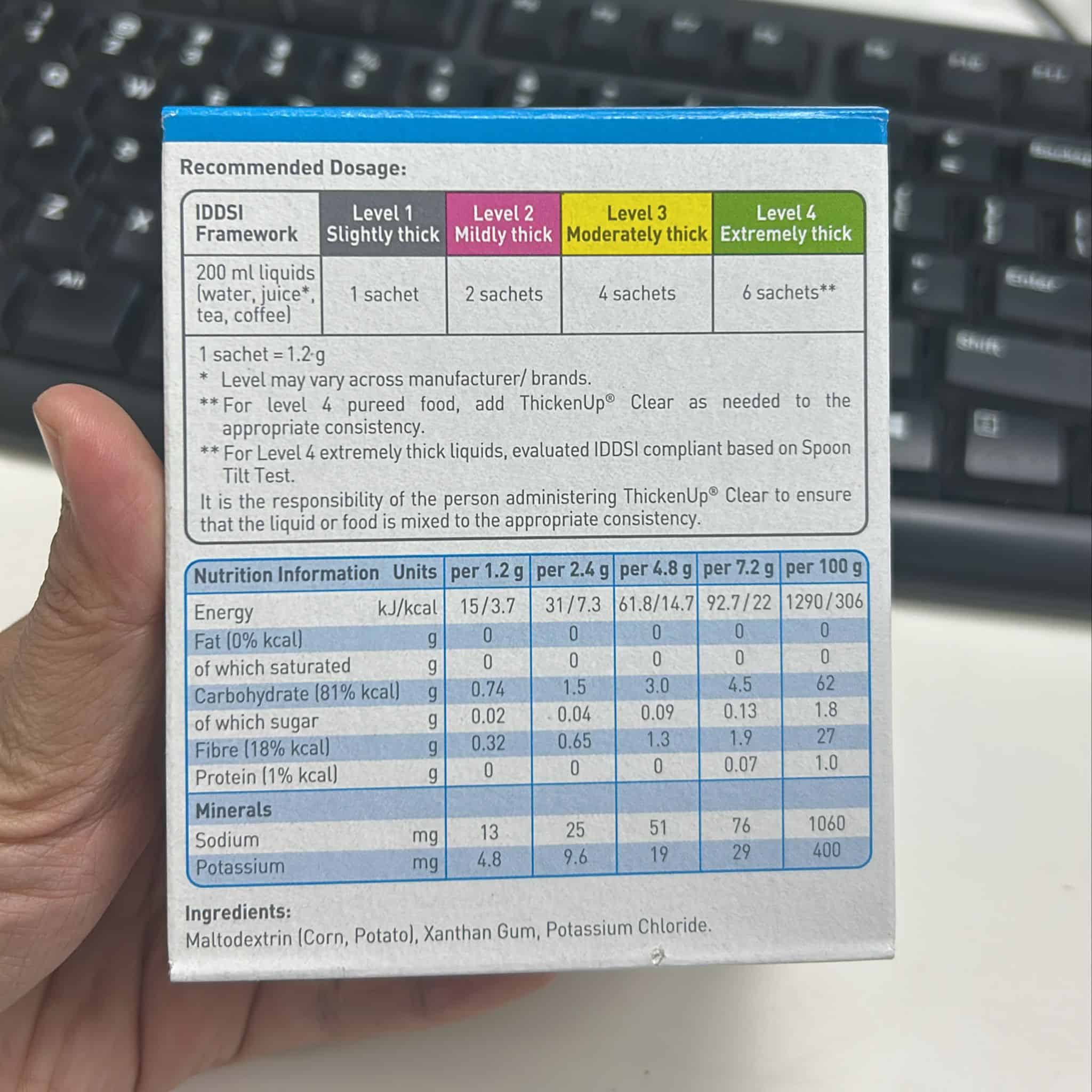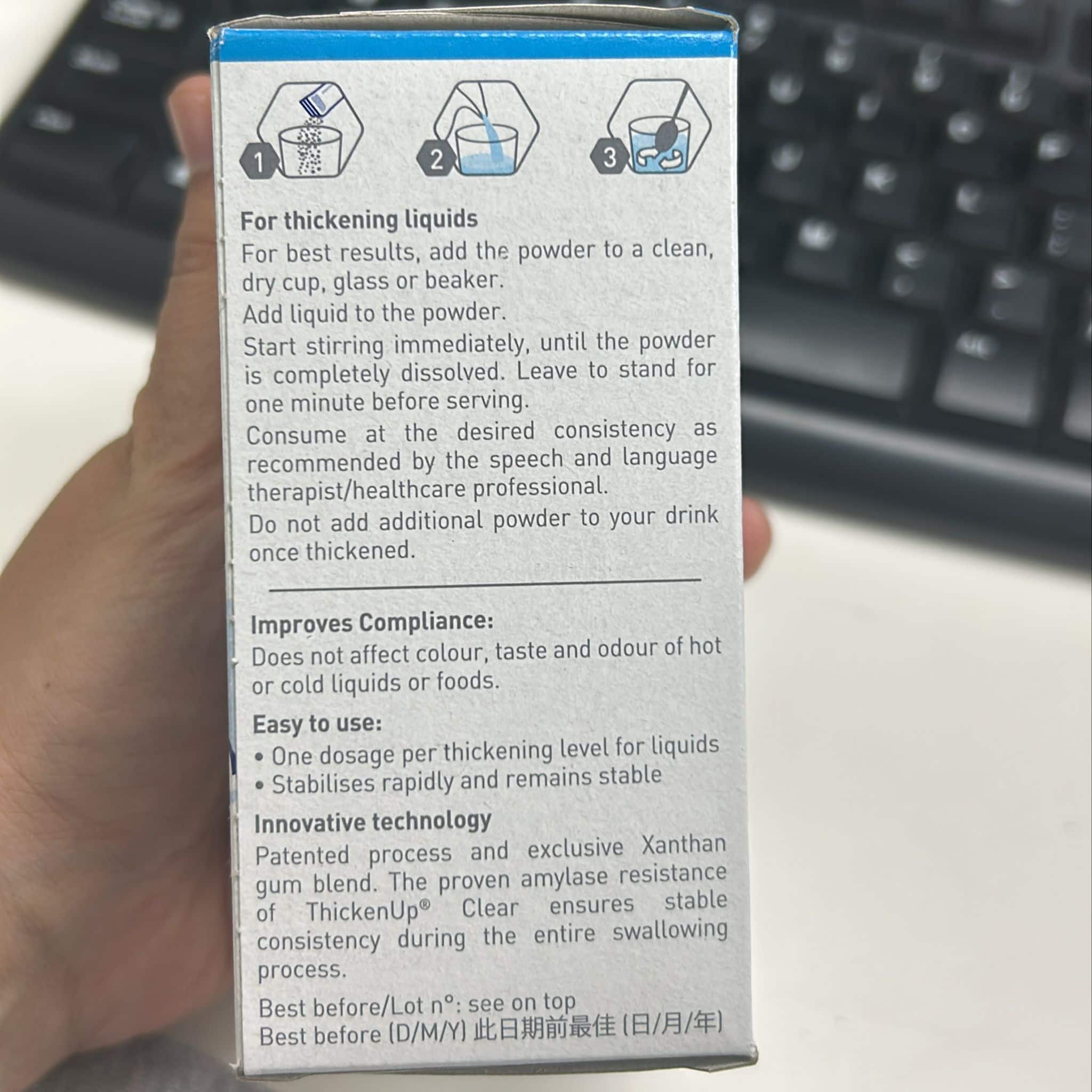 ThickenUp Clear uses xanthan gum-based technology, resulting in a smooth, lump-free texture that stays clear and stable over time. It’s suitable for both hot and cold liquids, ensuring flexibility in meal preparation.