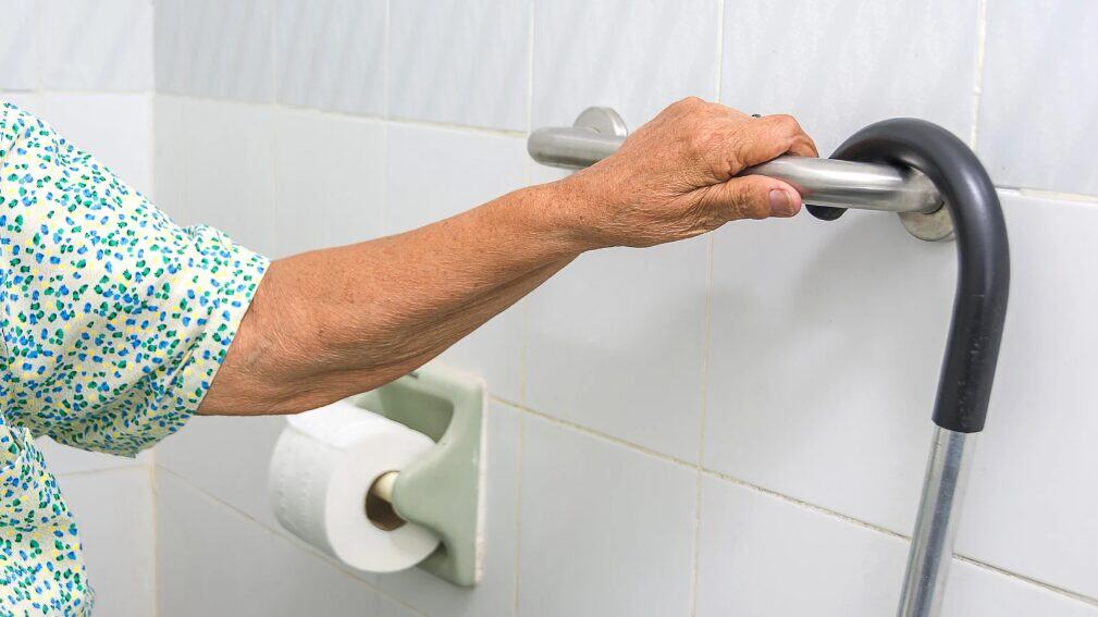 - Vertical grab bars are commonly installed next to toilets and in shower areas.